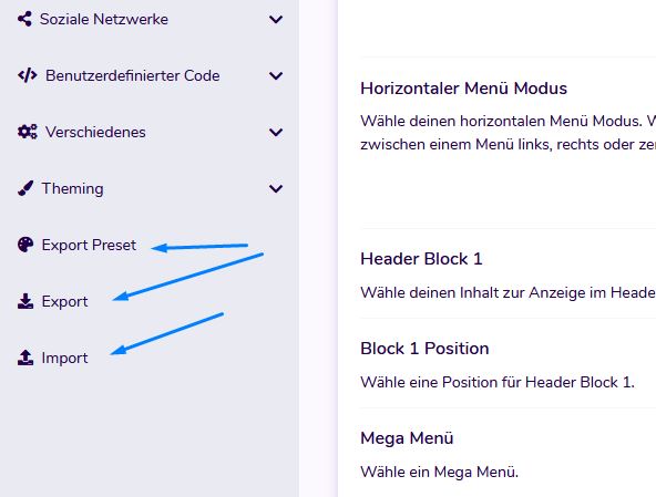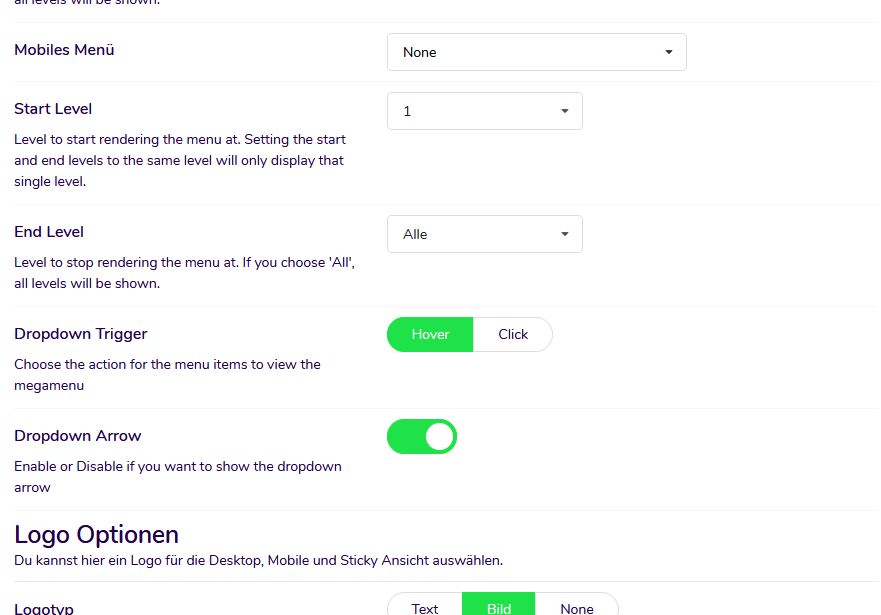 Sobald Sie mit diesen Einstellungen fertig sind, können Sie Ihr eigenes Mega-Menü für einzelne Menüpunkte erstellen. Die Struktur der Menüelemente der Hauptebene entspricht der Struktur Ihres Joomla-Menüs. Standardmäßig werden alle Untermenüelemente automatisch als Dropdown-Menüelemente angezeigt.